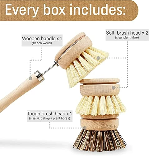- [ 𝟯 𝗜𝗡𝗧𝗘𝗥𝗖𝗛𝗔𝗡𝗚𝗘𝗔𝗕𝗟𝗘 𝗛𝗘𝗔𝗗𝗦 ] – This set contains 3 interchangeable bubble-up dish brush heads that transform the beechwood handle into a vegetable brush scrubber for food for gentle cleaning, a dish scrubber brush for stubborn pots and pans, as well as an eco cleaning tool for around the house