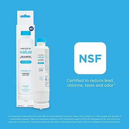 Details: Certified to reduce lead, chlorine, taste, and odor, everydrop value filters offer convenient, filtered water for you and your family. For the cleanest water, replace your everydrop value filter every 6 months (or 300 gallons). everydrop value Ice & Water Refrigerator Filter S2 compares to Samsung HAF-CIN.