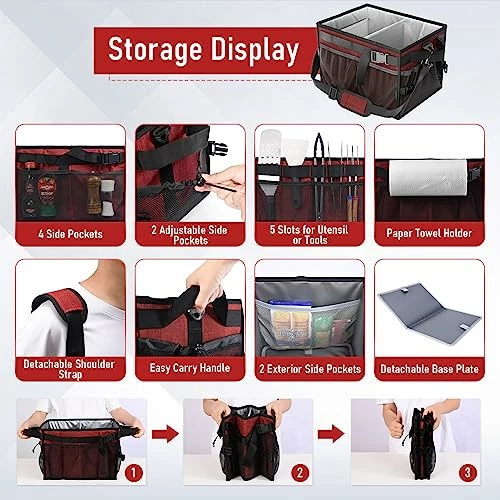 - Easy Carry & Versatile- Features with a detachable padded shoulder strap and easy carry handle for your convenience, make carrying stuff in and out to outdoor activities much easier, saves your time repeated between grill and your kitchen, a great table tool caddy for grilling, picnic, patio, camping, barbecue, outdoor dinner, griddle, rv, also an ideal gift for grilling lover and camper