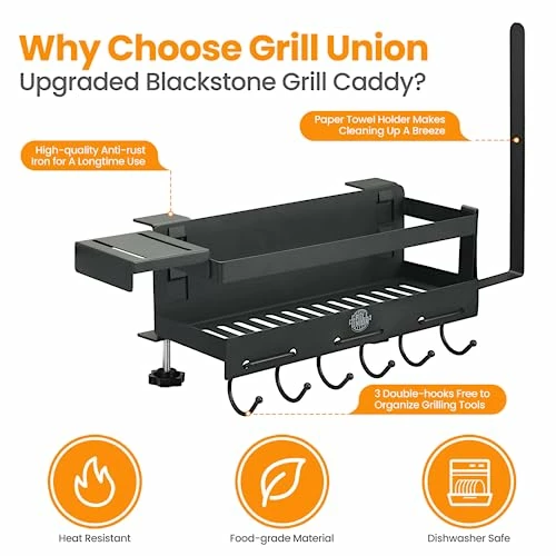 - â Premium Quality Construction: The Grill Union grill griddle caddy is crafted from high-quality, anti-rust iron, ensuring durability and longevity. It is expertly designed with ample depth and width to accommodate all your griddle accessories, making it an ideal companion for outdoor grill campsites.